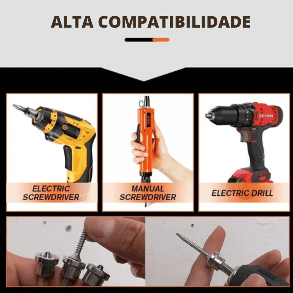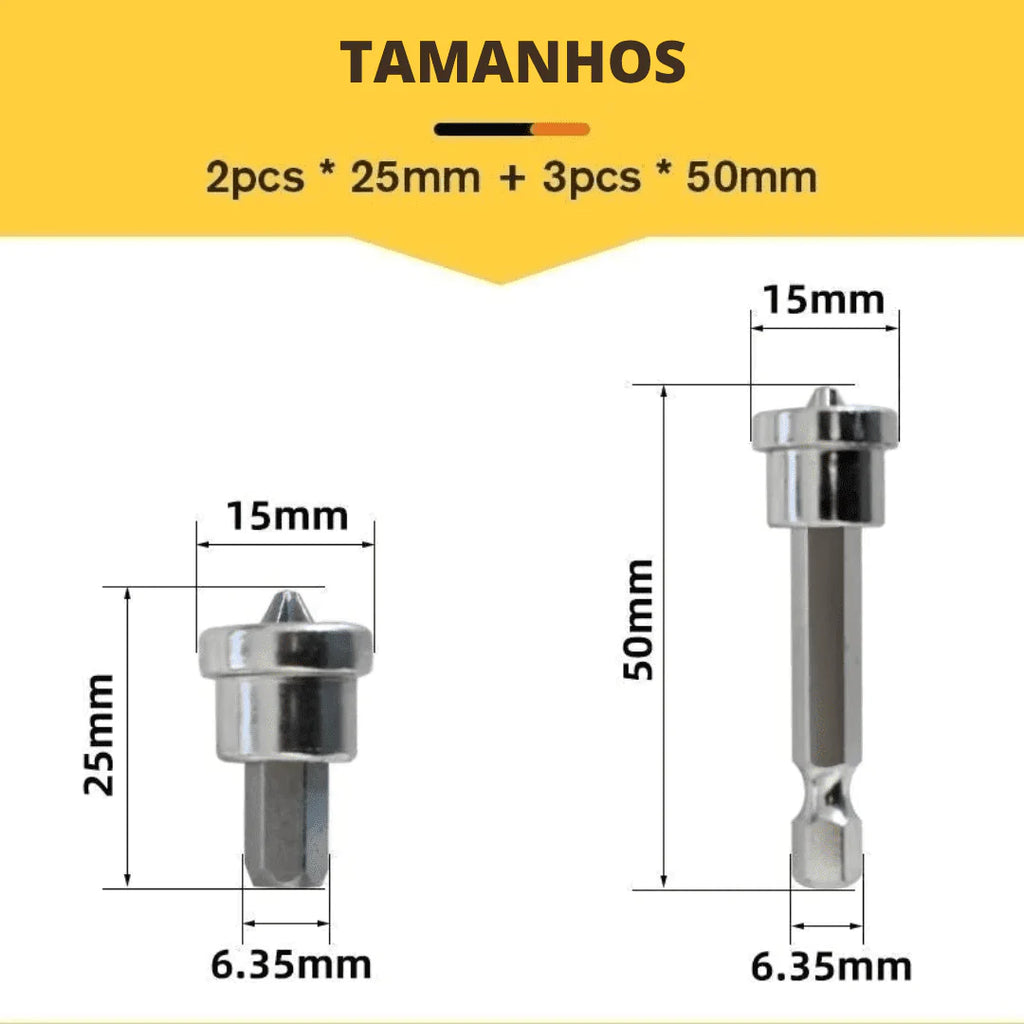 Esses bits ajudam você a fixar o parafuso exatamente no lugar, sem se preocupar com oscilação ou direção errada. Acelere o processo de torção de parafusos para que você possa trabalhar com mais eficiência e facilidade!