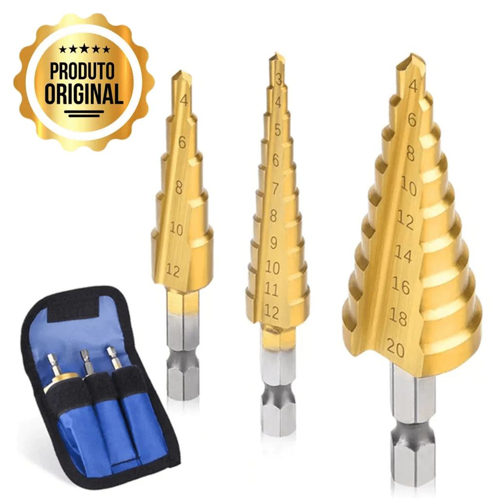 Este incrível jogo de brocas incluem 3 brocas individuais modernas, com revestimento em titânio, adequado para perfurar qualquer tipo de material com muita praticidade e desempenho.