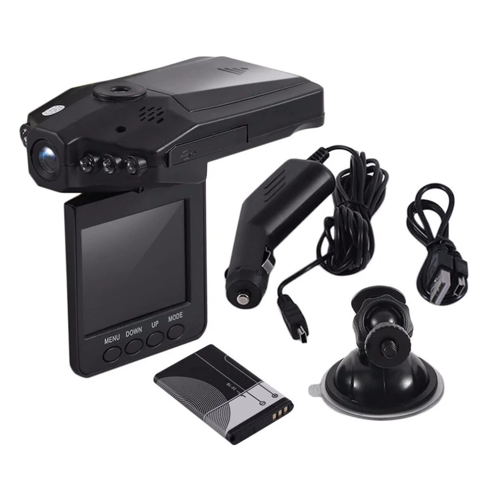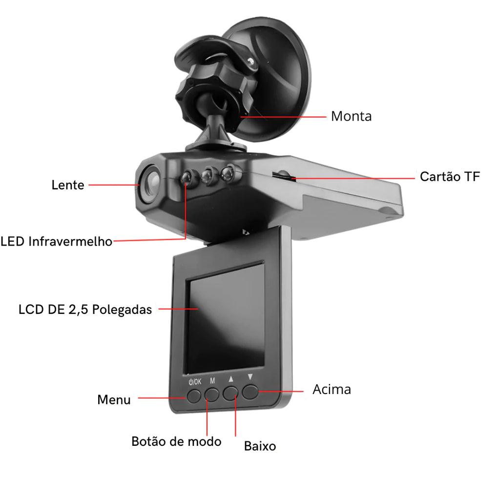1x Câmera Automotiva | Car Recording; 1x câmera automotiva portátil HD DVR tela 2,5; 1x Bateria backup; 1x suporte para fixação no para-brisa; 1x carregador veicular;