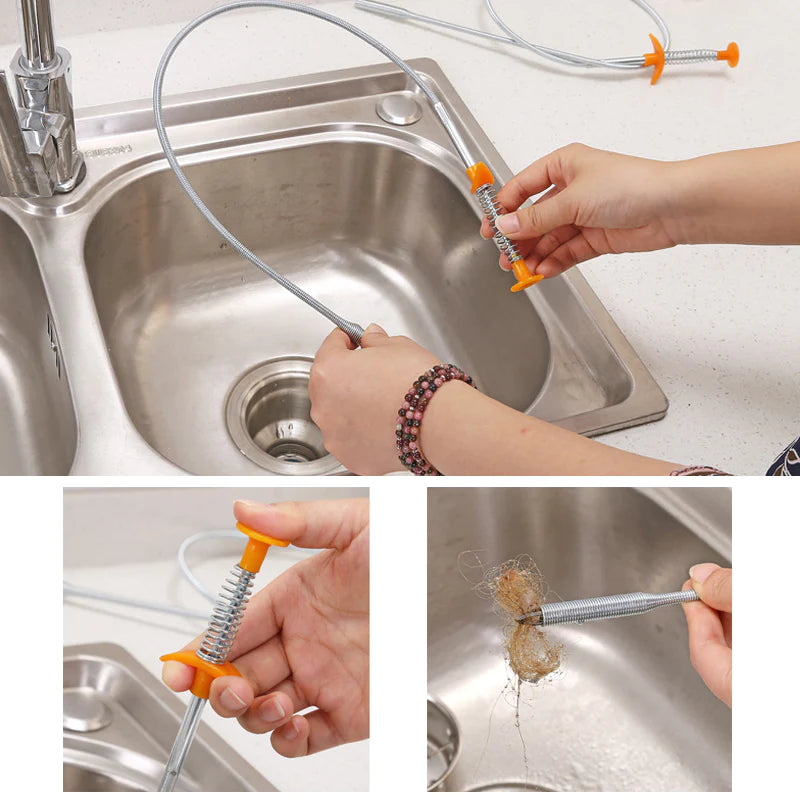 Fácil de usar. Este limpador de ralos é muito conveniente de usar. Basta deslizar pelo ralo o máximo possível, retirar a obstrução, limpá-la e usá-la novamente.