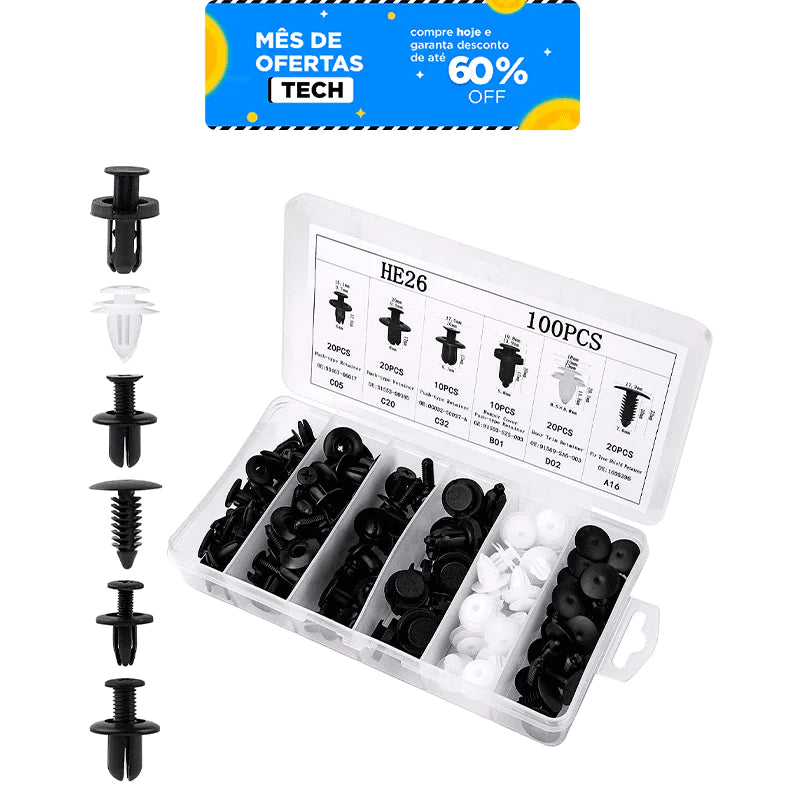 Contém 100 unidades de diversos tamanhos, que se encaixam perfeitamente na ampla maioria dos modelos de veículos e diversas peças.