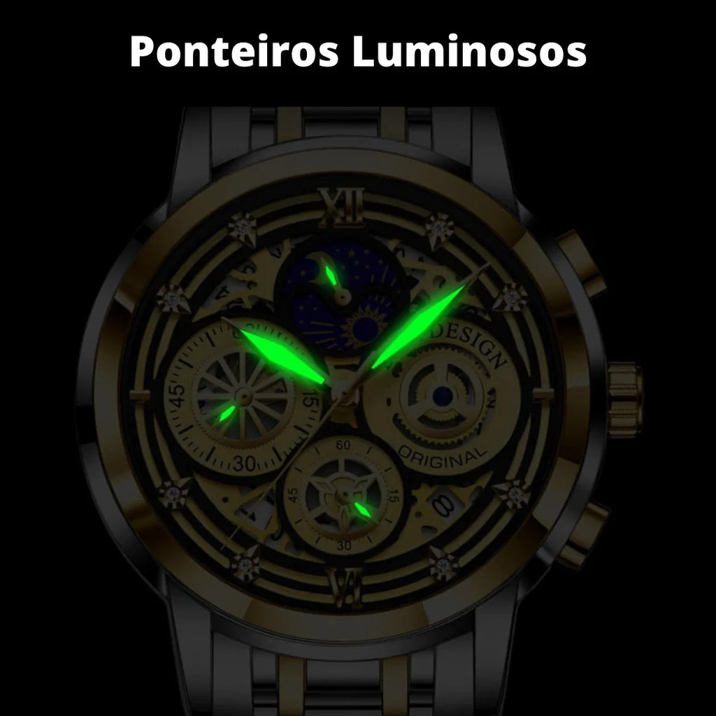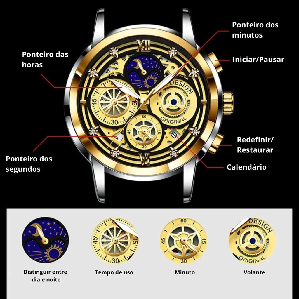 • Características: Cronógrafo, Calendário automático, Data automática, Fases da lua, Cronômetro, Ponteiros luminosos